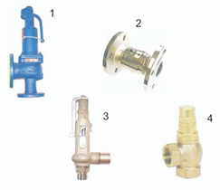 Vollhub- oder Proportional-Feder-Sicherheitsventile (1), Flanschanschluß oder Innengewinde, Durchgangsform (2) oder Eckform (3), aus Grauguß, Stahlguß, Edelstahl (3) und Rotguß (4), mit gasdichtem Anlüftehebel, gasdicht mit Lüfteknopf oder mit geschlossener Federhaube, zusätzlich mit TÜV-Einstellbescheinigung, für verschiedene Medien und Anwendungen, Ansprechdrücke bis 630 bar.